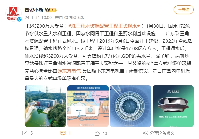 [国资小新]超3200万人受益!#珠三角水资源配置工程正式通水#