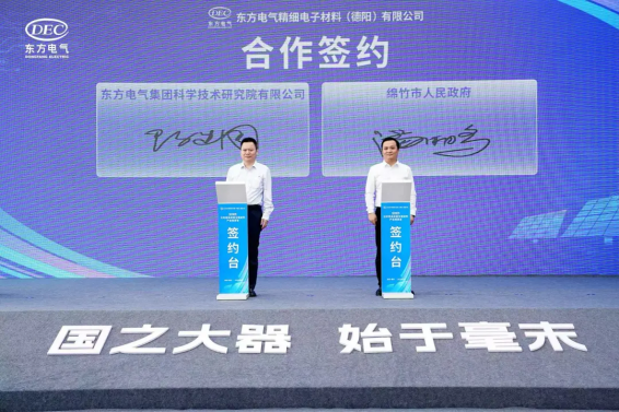 会上,东方精材分别与无锡帝科、杭州华光签订合作协议,绵竹市政府与东方研究院签署合作协议,东方江峡产业投资、德阳投资控股集团、四川绵竹高发投资集团、东方研究院签订合作协议,江苏瀚思瑞与四川绵竹高新技术产业园区签订合作协议。